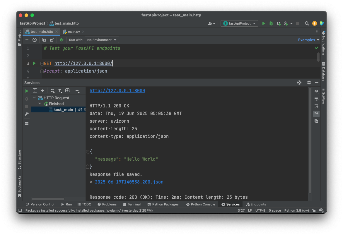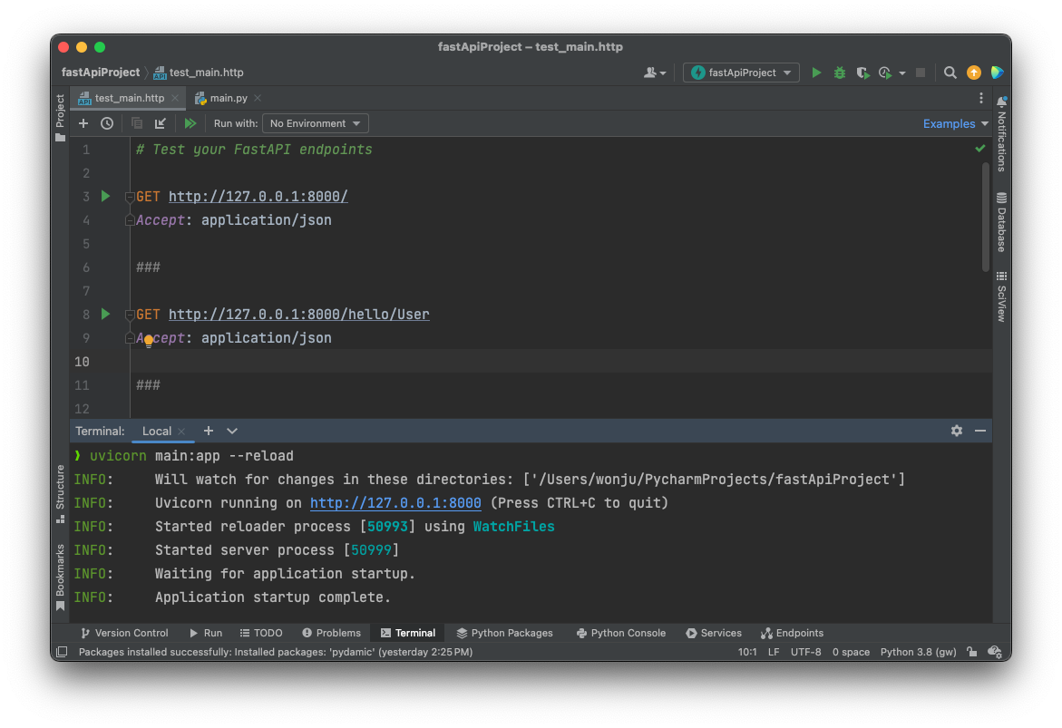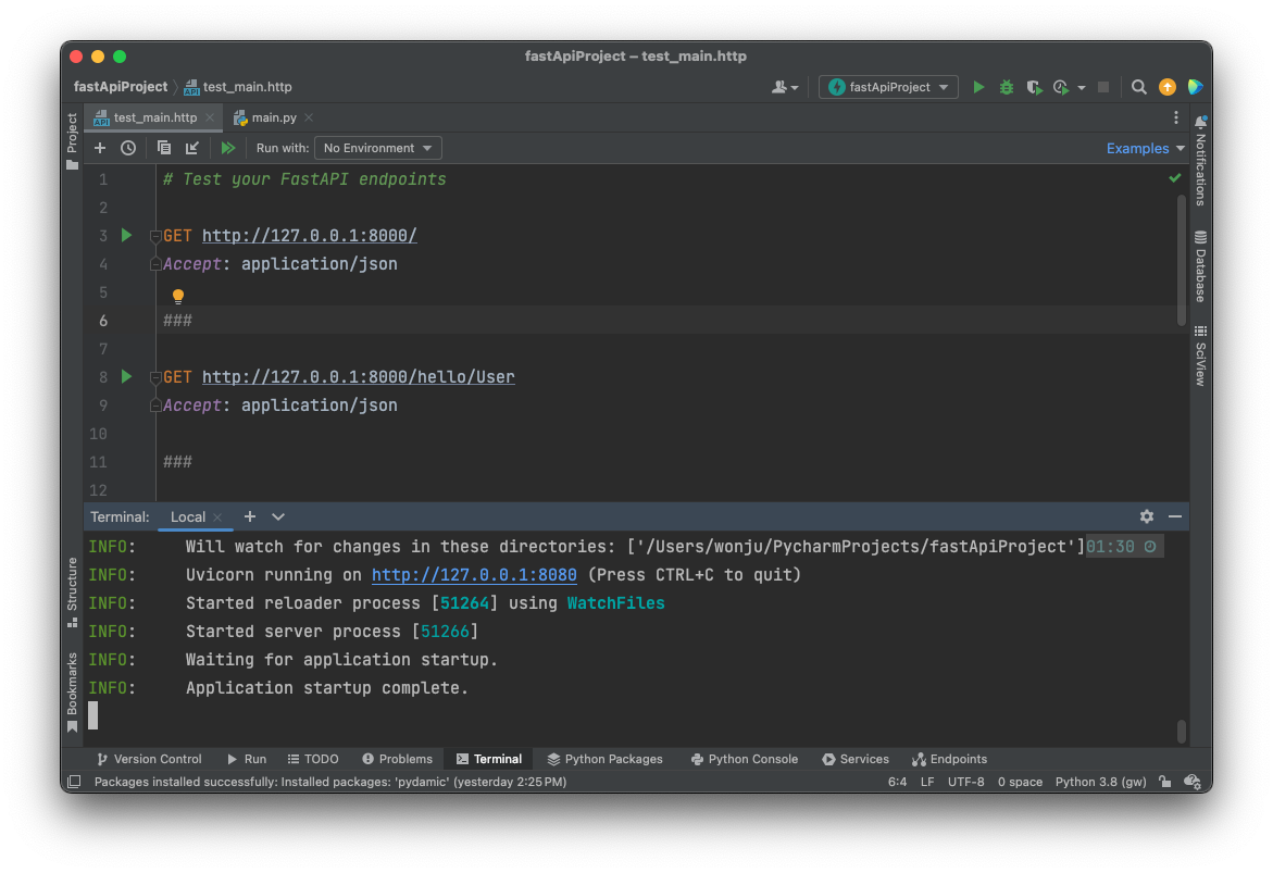 - main.py 에서 선언된 / 경로대로 return 메시지 출력